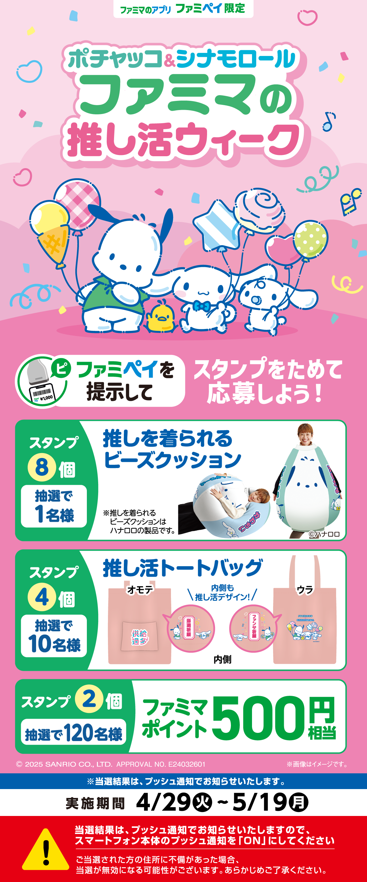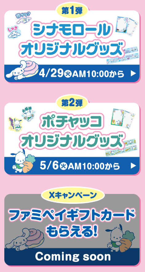 @famima_now\\ #ファミマの推し活ウィーク // 4/29(火)10時からスタート✨️ 対象商品を2個ご購入で、 #推し活 にピッタリ⭐️ サンリオ大人気キャラクター #ポチャッコ と #シナモロール のオリジナルグッズがもらえる♥️ 盛りだくさんのグッズは画像をTAP🔽 詳しくはコチラ🔽 family.co.jp/campaign/spot/… pic.x.com/MfFT52G5YQ x.com/famima_now/sta…