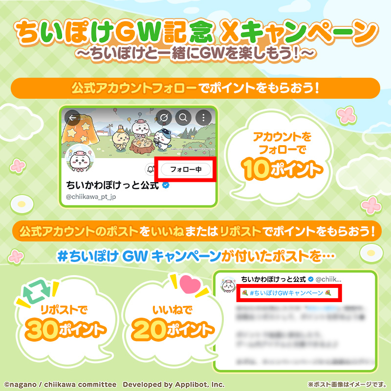 @chiikawa_pt_jp💐#ちいぽけGWキャンペーン💐 ポイントを獲得する方法は全部で5つ! それぞれの条件を達成するごとにポイントを獲得できるので、期間中毎日挑戦してみてくださいね♪ ▼詳細はキャンペーンページをチェック▼ rakusta.net/ja/campaign/60… #ちいぽけ #ちいかわぽけっと pic.x.com/bJH14Cq3LM