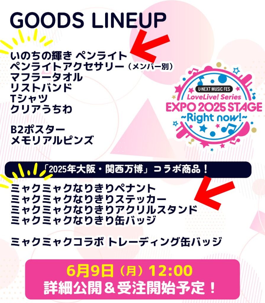 『ラブライブ!』大阪・関西万博コラボのビジュアルに衝撃 グッズ情報解禁で「いのちの輝き ペンライト」 …メモリアルピンズ ミャクミャクなりきりペナント ミャクミャクなりきりステッカー ミャクミャクなりきりアクリルスタンド ミャクミャクなりきり缶バッジ ミャクミャクコラボ… (出典:オリコン) |