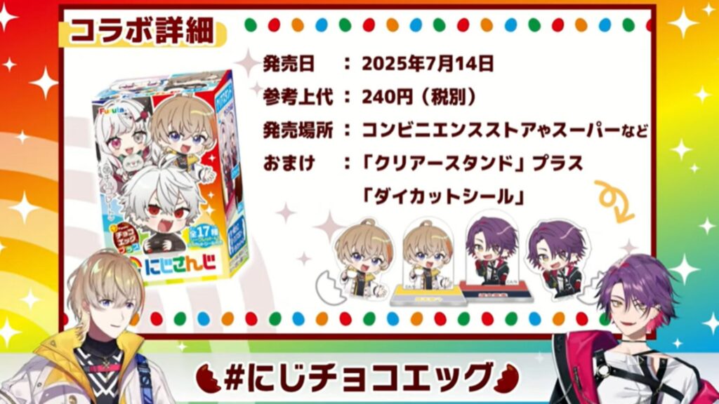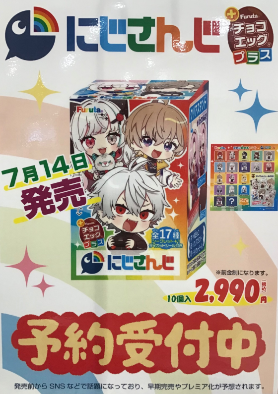 @sQDZFsDcLRC4g2Zにじさんじチョコエッグ来たーー! 「チョコエッグプラス」ってのも対象年齢が普通のチョコエッグより高めだからとかなんとか…… プラスがついて第1弾がにじさんじとか素晴らしい👏 今後、他人気vtuber事務所とコラボしたら売上強そう x.com/furuta_seika/s…